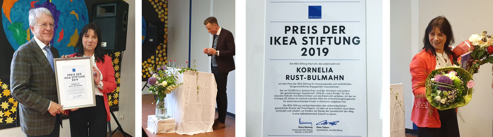 Mit der Preisverleihung an Kornelia Rust-Bulmahn ehrt die IKEA Stiftung die Gründerin der gemeinnützigen Gesellschaft „Hilfe für unsere Kinder“ in Hannover. Ausgezeichnet wird die Preisträgerin für ihren ausdauernden und kreativen Einsatz für die Belange von benachteiligten Kindern.