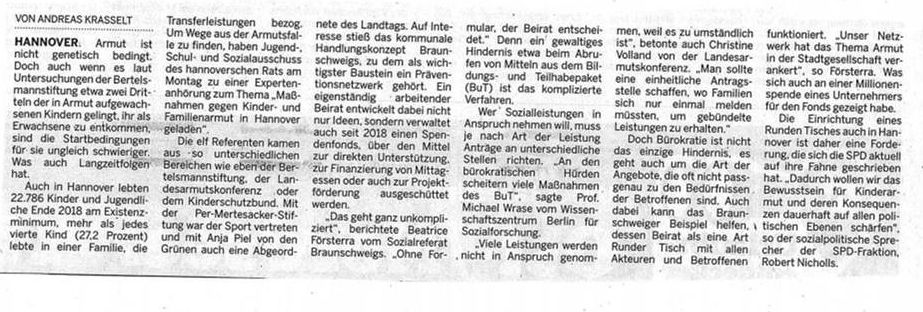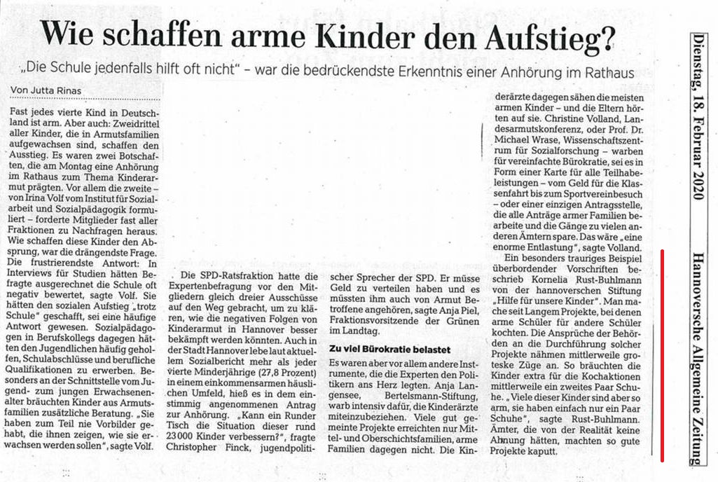 Zum Thema "Maßnahmen gegen Familien- und Kinderarmut in Hannover" wurde ich als Expertin in den Sozialausschuss des hannoverschen Rats geladen. Es hat sich wieder eindrücklich gezeigt, wie viel Armut es noch immer gibt. Die Anhörung hat aber auch Hoffnung gemacht, dass das Thema weiterhin öffentliches Gehör bekommt. Es hat mir auch wieder gezeigt, dass es Menschen gibt, die sich einsetzen um diesen Umstand zu ändern. Ich habe die Gunst der Stunde genutzt um auf die "Über-Bürokratie" hinzuweisen. Hier die Eindrücke der HAZ und NP zur gestrigen Anhörung: