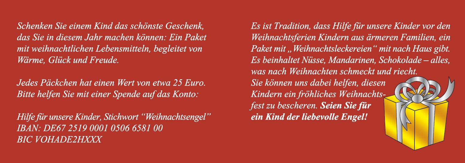 In dieser Adventszeit ist alles anders als wir es bisher gewohnt waren. Weihnachtsfeiern in Firmen, Adventsveranstaltungen, geselliges Zusammensein mit Freunden und auch die so sehr geliebten Weihnachtsmärkte finden in diesem Jahr nicht statt. Statt zu feiern und zu konsumieren zwingt uns das Virus zur Ruhe und Bescheidenheit. Das ist aber auch eine Chance unsere Gewohnheiten zu hinterfragen und darüber nachzudenken, was wirklich für uns zählt und wichtig ist. Gerade in dieser schwierigen und bewegten Zeit können wir anderen helfen und viel Gutes tun. Wie wäre es, wenn Sie in diesem Jahr einen Teil des Geldes, das Sie nicht im Restaurant oder auf dem Weihnachtsmarkt ausgegeben haben, für unsere Kinder spenden? So wird aus dem Verzicht das gute Gefühl, einem Kind eine große Freude gemacht zu haben.